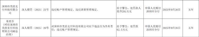 近日,中国人民银行深圳市分行官网公示的行政处罚决定书显示,美的支付因违反账户管理规定、违反清算管理规定,被警告并罚款281万元。同时,易某芬(时任深圳市美的支付副总经理)对美的支付违反账户管理规定行为负有责任,被给予警告并罚款62.5万元。