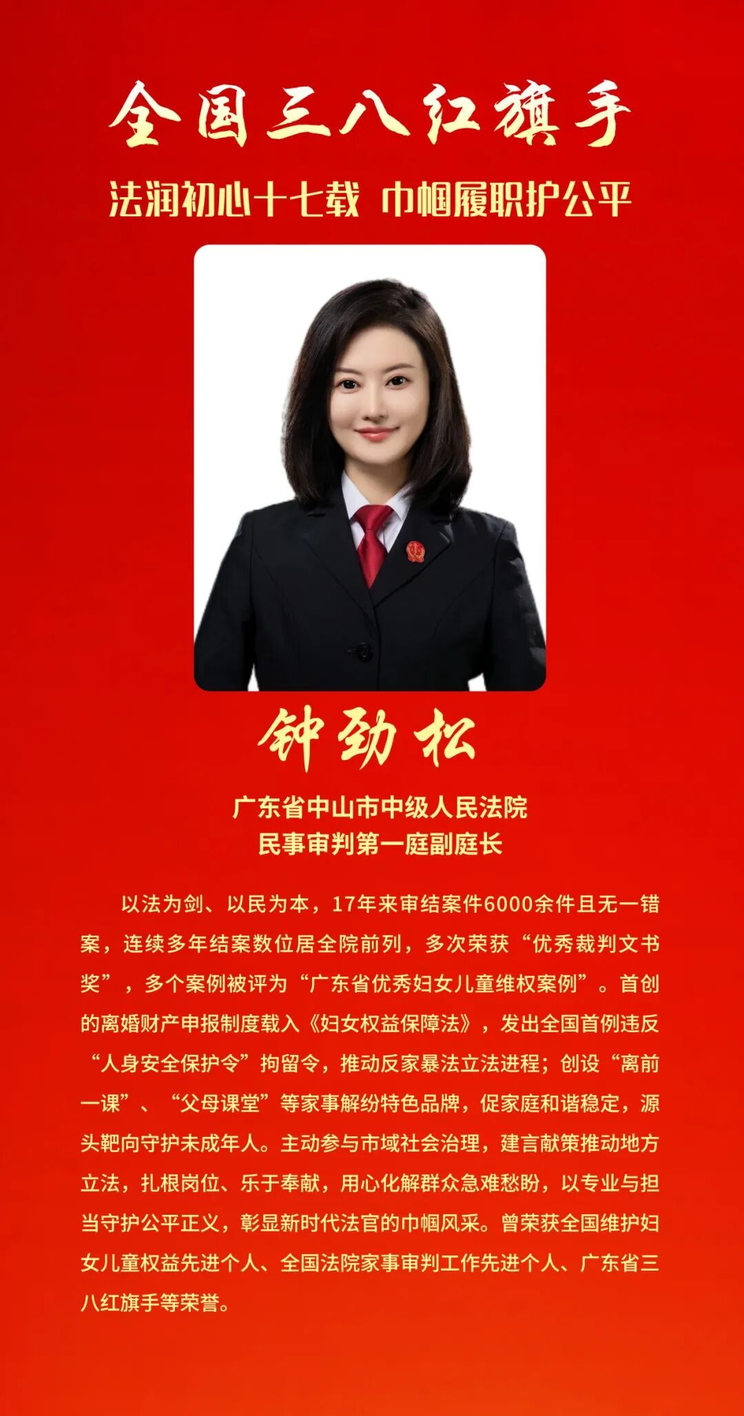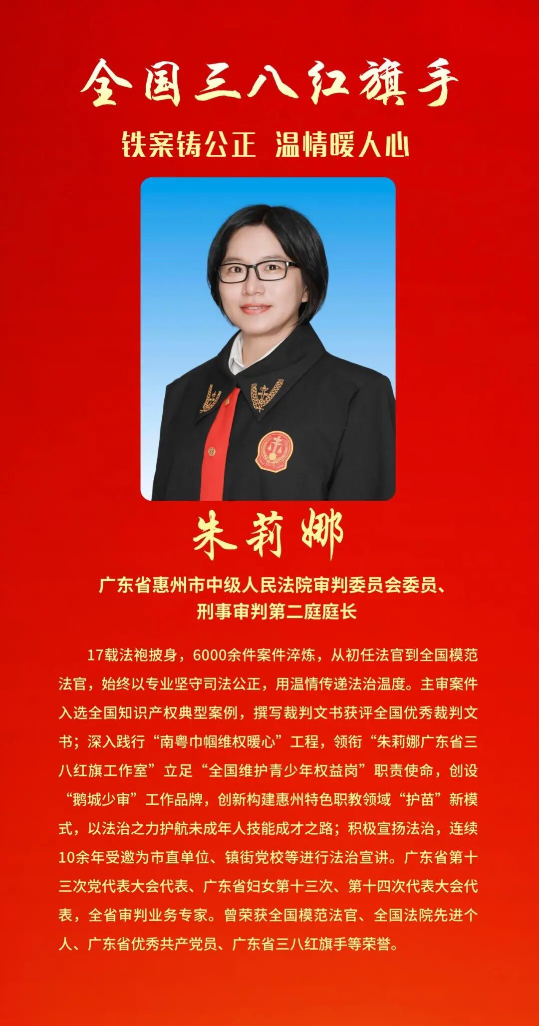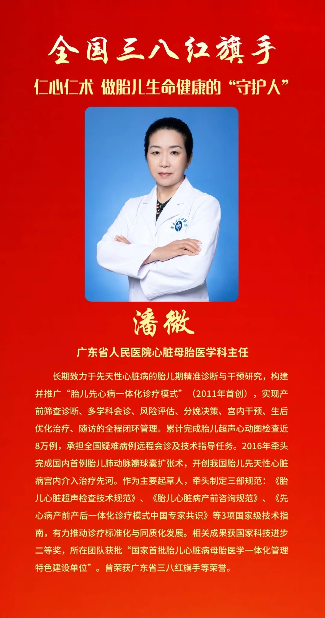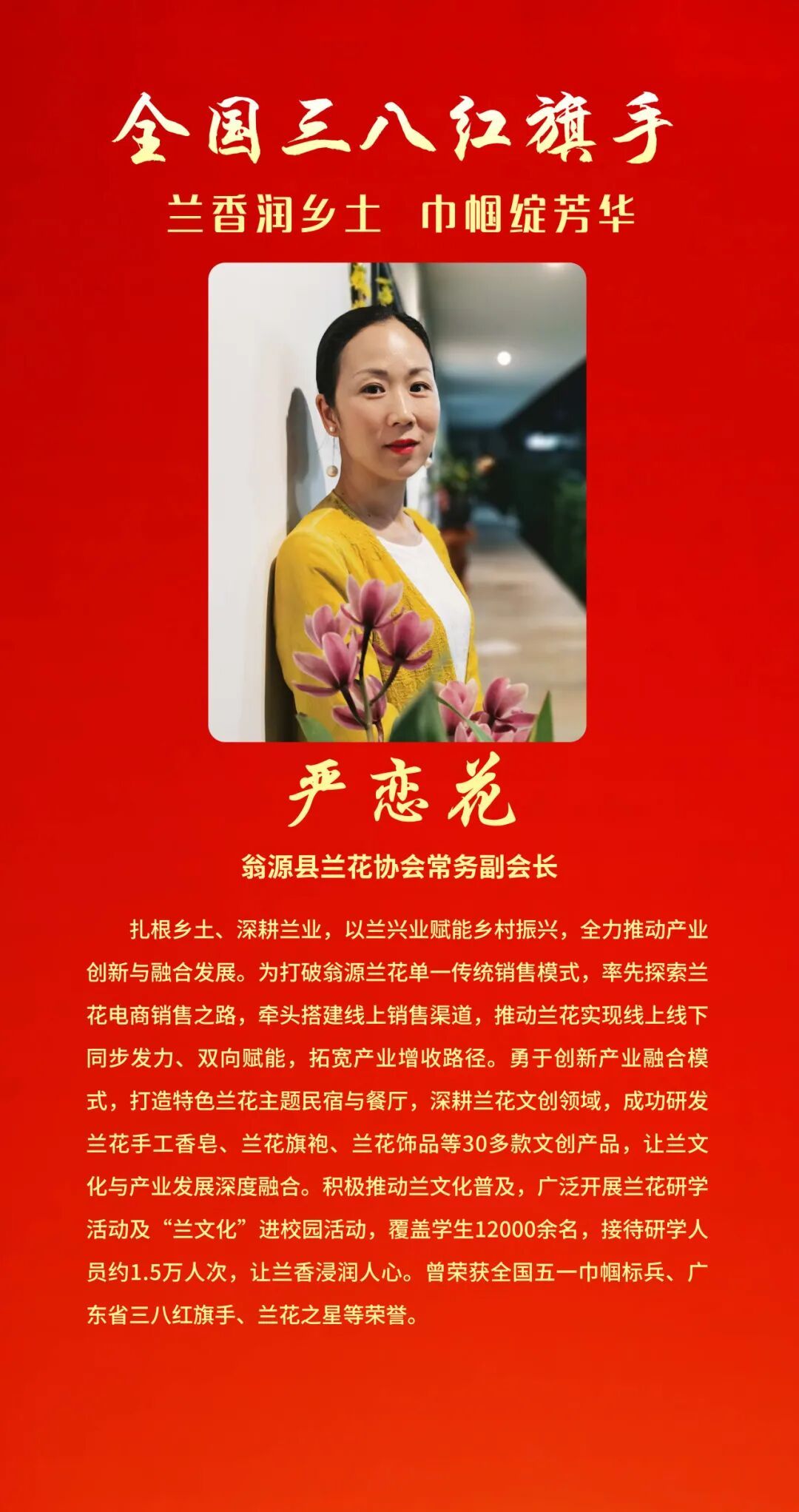 为表彰先进、树立榜样, 充分发挥先进典型和模范人物示范作用, 全国妇联决定, 授予兰臻等9人全国三八红旗手标兵称号, 授予阮祥燕等598人全国三八红旗手称号, 授予中国人民抗日战争纪念馆社会教育部等400个单位全国三八红旗集体称号, 授予首都医科大学附属北京同仁医院耳鼻咽喉头颈外科等600个单位全国巾帼文明岗称号。