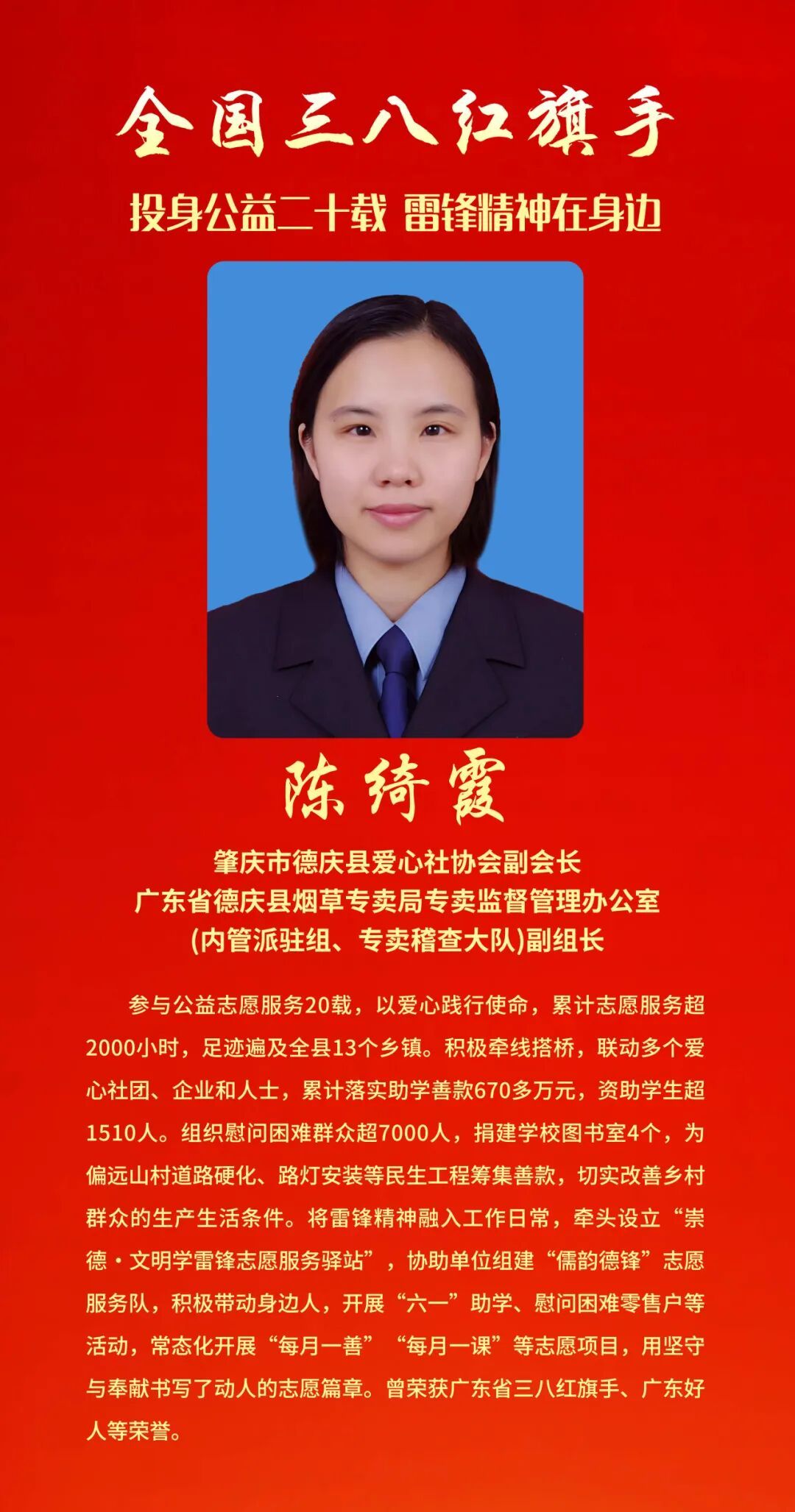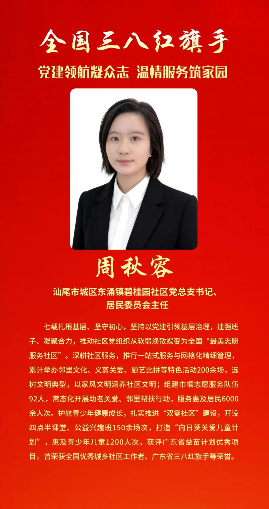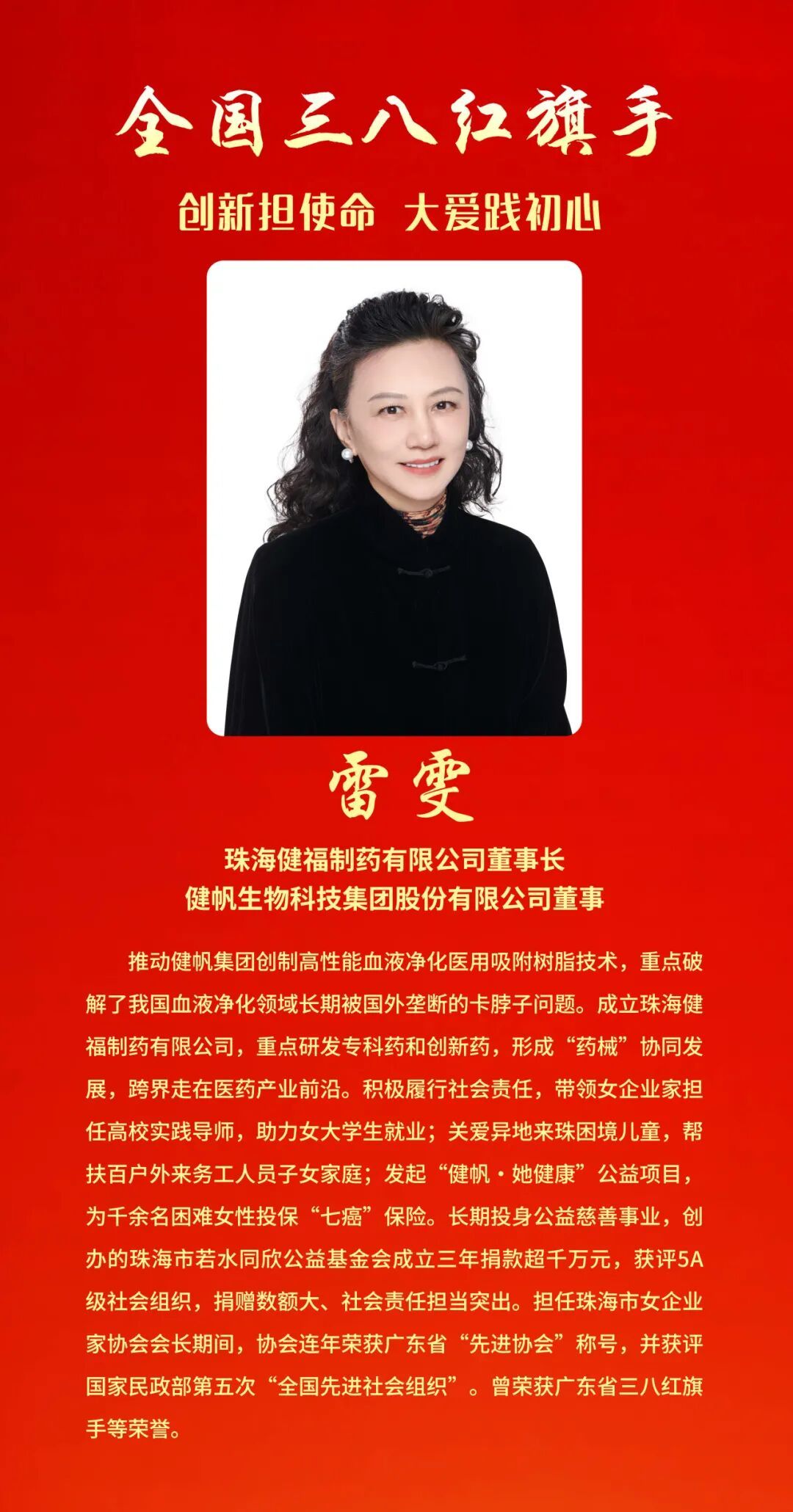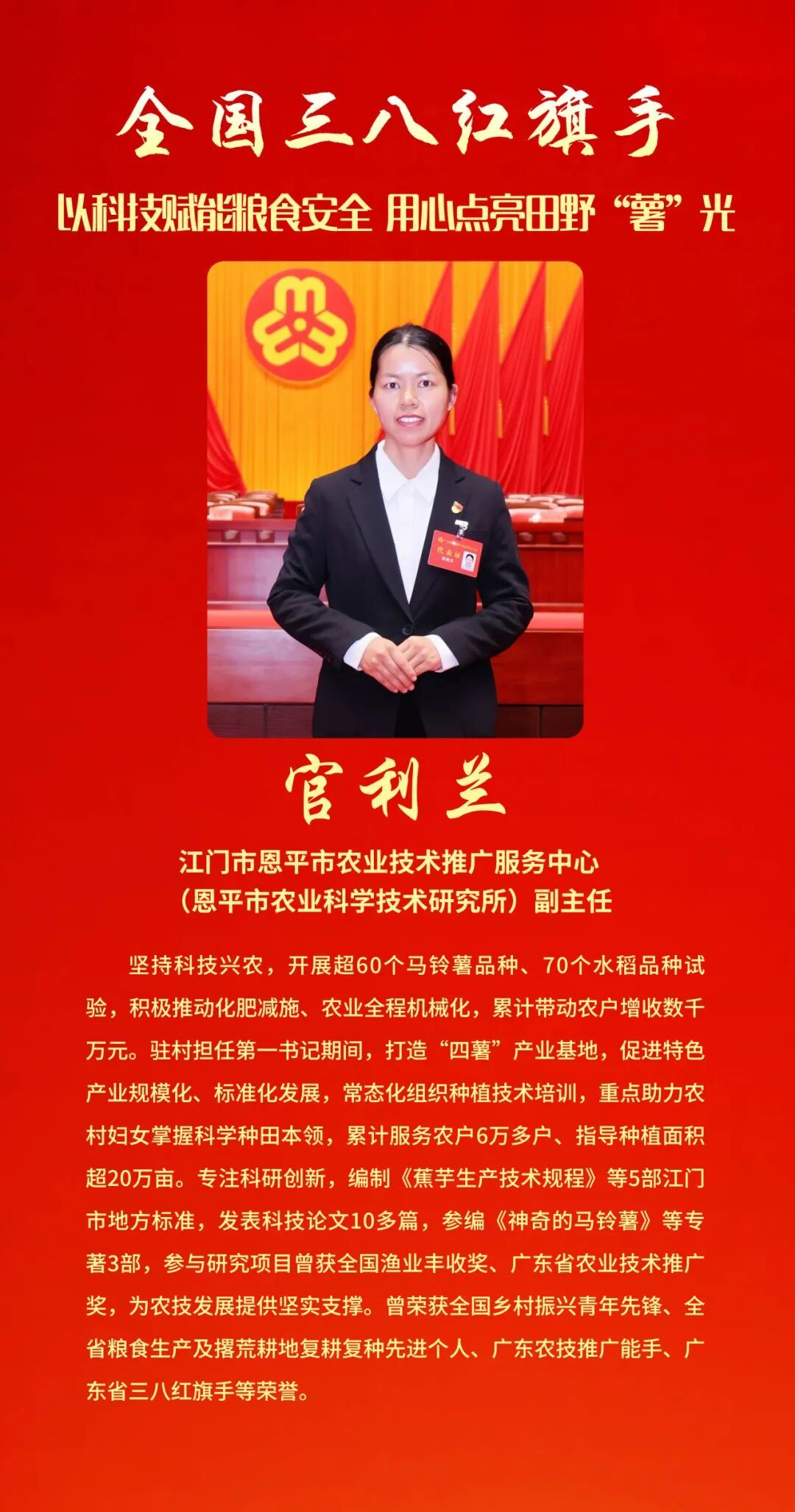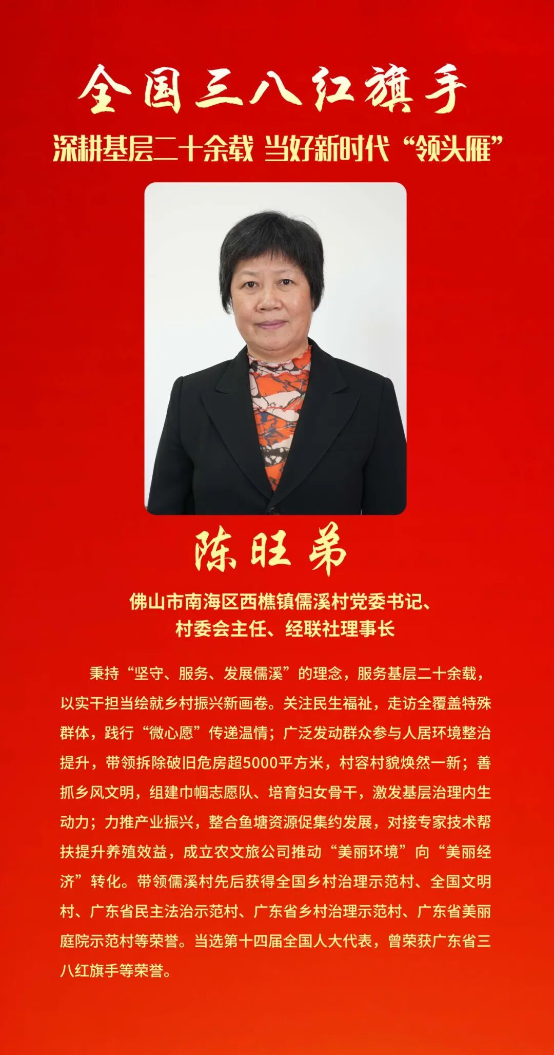 为表彰先进、树立榜样, 充分发挥先进典型和模范人物示范作用, 全国妇联决定, 授予兰臻等9人全国三八红旗手标兵称号, 授予阮祥燕等598人全国三八红旗手称号, 授予中国人民抗日战争纪念馆社会教育部等400个单位全国三八红旗集体称号, 授予首都医科大学附属北京同仁医院耳鼻咽喉头颈外科等600个单位全国巾帼文明岗称号。